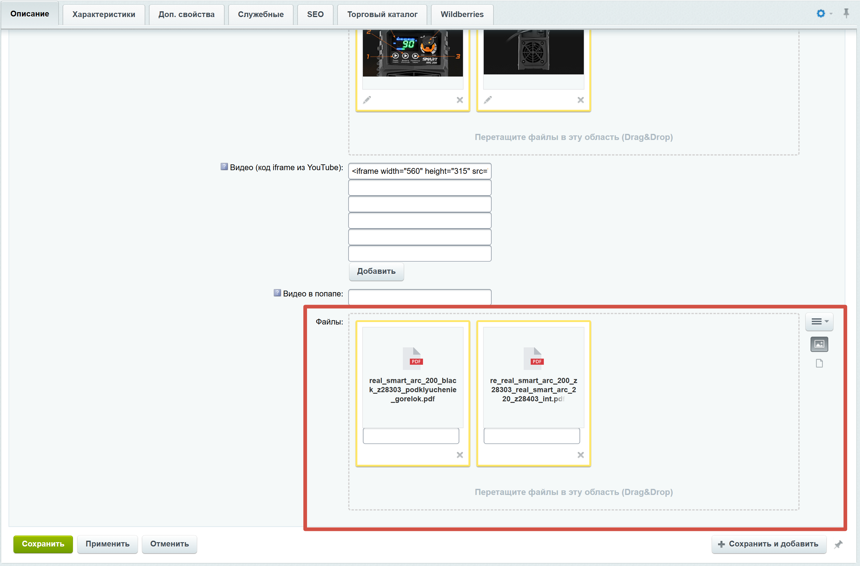 Данное поле подразумевает заполнение сертификатов качества товара, инструкций и прочей технической документации