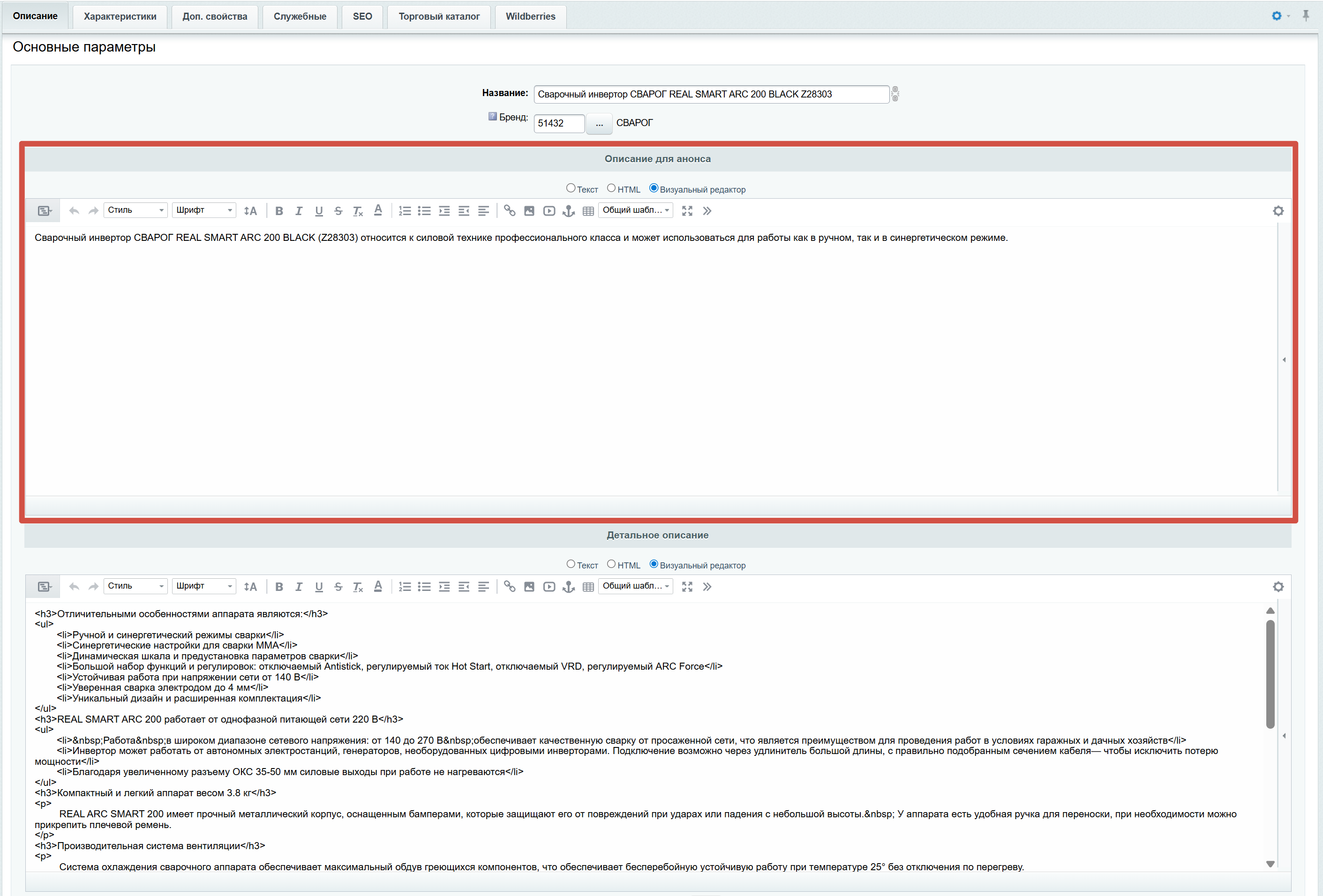 Тут должно быть наиболее полное описание товара. Информацию нужно найти на официальном сайте производителя или дистрибутора. Если данных нет или они слишком короткие - использовать ИИ (например, ChatGPT) для генерации черновика описания на основе ключевых характеристик, после генерации обязательно сверить текст с реальными данными, убрать «вымыслы», оставить только подтвержденные факты.