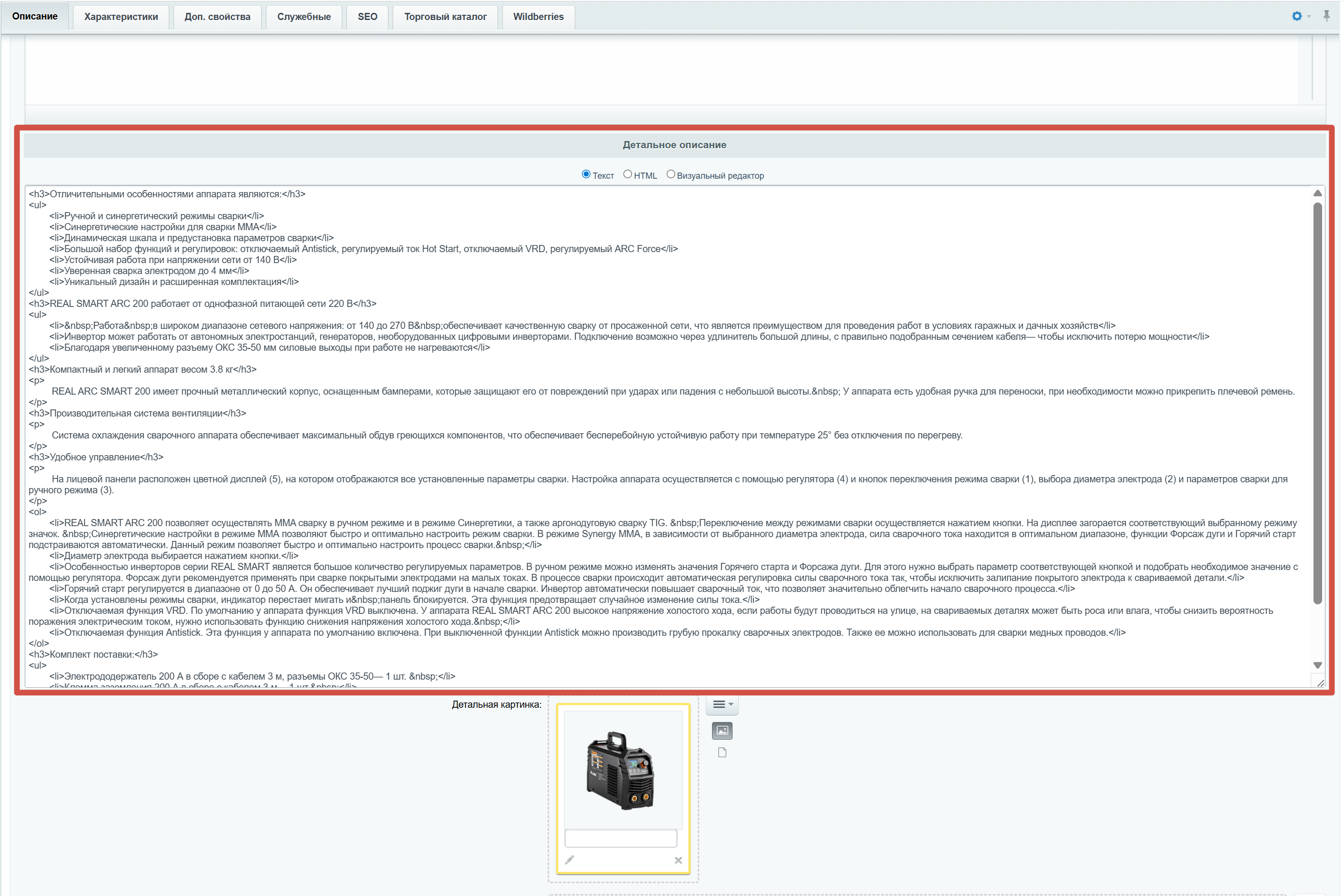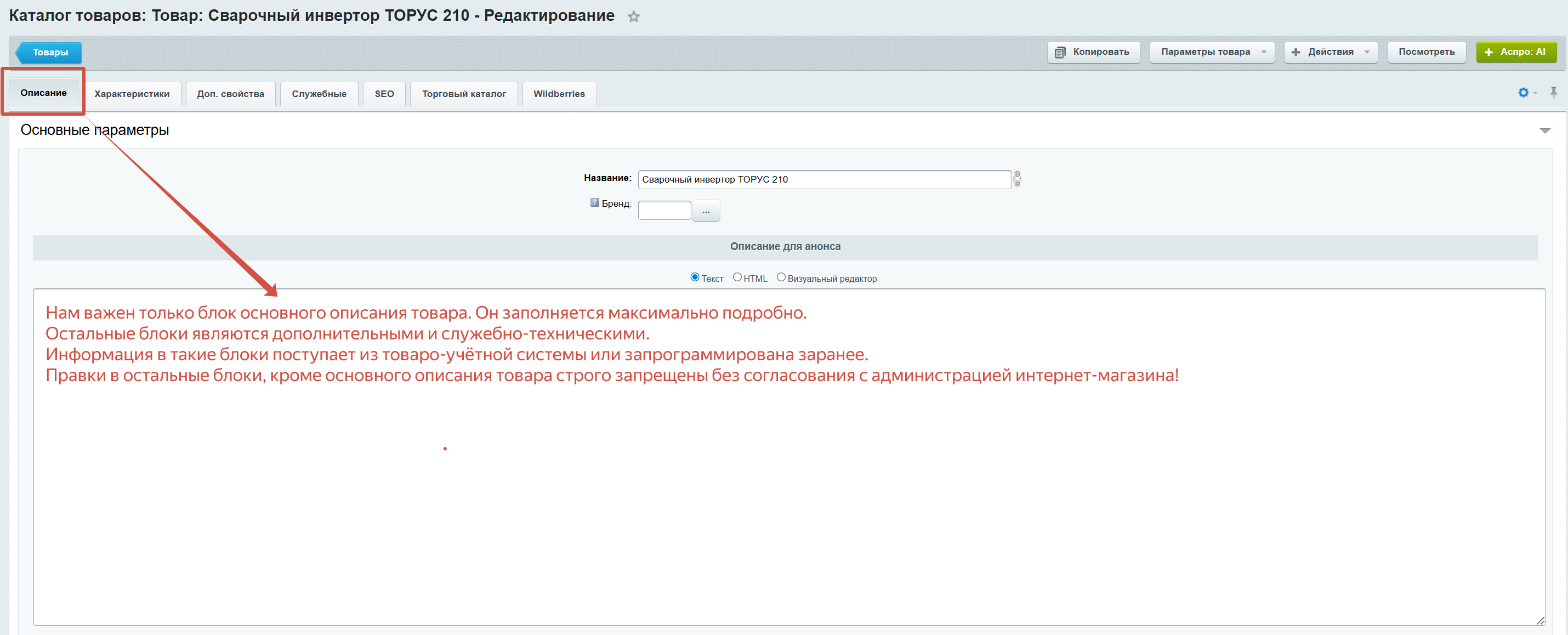 В товаре существует несколько вкладок (табов). Нам нужно обратить внимание только вкладку "Описание", именно там сосредоточены большинство полей для качественного описания товара. Поля и данные в остальных вкладках, без необходимости не трогаем